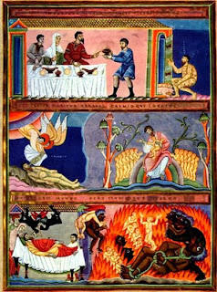 β) και ο πλούσιος;;;“Ἀπέθανε δὲ καὶ ὁ πλούσιος καὶ ἐτάφη καὶ ἐν τῷ ἅδη ἐπάρας τοὺς ὀφθαλμούς αὐτού, ὑπάρχων ἐν βασάνοις, ὁρά τὸν Ἀβραάμ ἀπό μακρόθεν καὶ Λάζαρον ἐν τοῖς κόλποις αὐτοῦ “…μετά το θάνατό του ο πλούσιος μεταφέρθη, άγνωστο από ποιους, σε τόπο οδύνης και στεναγμών. Σε τόπο που δεν υπάρχει αναψυχή, αλλά πυρ και σκότος, φλόγες και οδύνη, όπου πολυπόθητο αναψυκτικό είναι μια σταγόνα ύδατος για να καταψύξει την καιομένη και φλογισμένη γλώσσα. Αλλά γιατί αυτή η σκληρή και ανελέητος τιμωρία; Γιατί ήταν κατά τύχη ή κατά κληρονομιά πλούσιος;…ΟΧΙ!ΟΧΙ! Γιατί και ο Αβραάμ πλούσιος ήταν και μάλιστα σφόδρα. Διότι ήταν ενδεδυμένος με πορφύρα; ¨Οχι τοσο και για αυτό. Διότι απολάμβανε κάθε μερα λαμπρώς; και τούτο θα εκκρίνετο επιεικώς λόγω της θέσεώς του! αλλα τότε γιατί; Γιατί βασανιζόταν και εφλογίζετο οδυνώμενος και η γλώσσα του επιθυμούσε μόνο μια σταγόνα νερό για αναψυχή; Διότι: