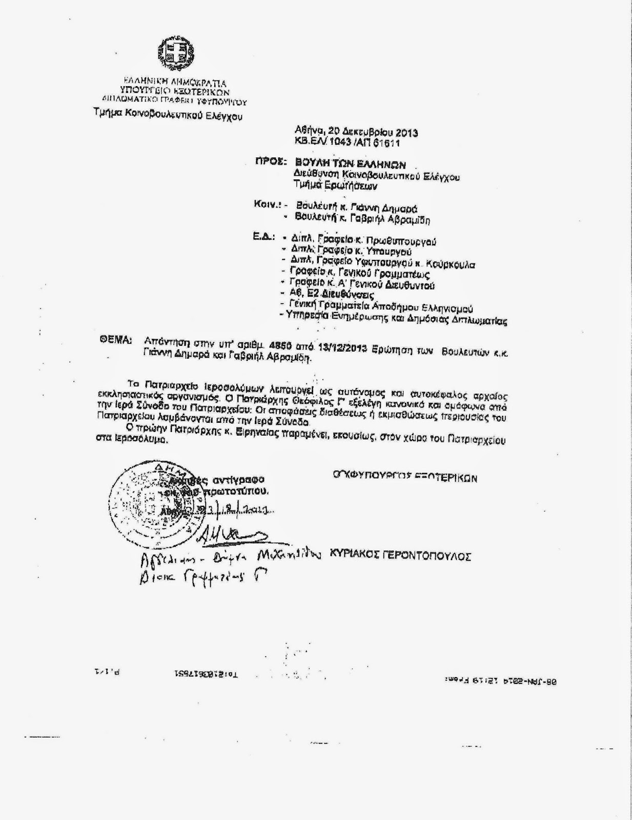 Το γεγονός και μόνο ότι η Ιερά Σύνοδος μιλάει για “απελευθέρωση του Πατριάρχη Ειρηναίου” αποδεικνύει πως πράγματι υπάρχει πρόβλημα. Η απόφαση δικαιώνει όλους όσους χρόνια τώρα φώναζαν προς κάθε κατεύθυνση για την επίλυσή του, και καθιστά υπόλογες τις μέχρι τώρα ελληνικές Κυβερνήσεις που έκλειναν προκλητικά τα αυτιά τους σε αυτές τις φωνές στηρίζοντας μια παράνομη και ανέντιμη πράξη. Μόλις πριν ένα χρόνο ο αρμόδιος υφυπουργός εξωτερικών είπε ψέματα στην Βουλή των Ελλήνων όταν απαντώντας σε σχετική ερώτηση Βουλευτών ισχυρίστηκε πως ο Πατριάρχης κ.Ειρηναίος παραμένει “οικειοθελώς” ..φυλακισμένος!!!!