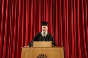 Τόν Σεβασμιώτατο συγγραφέα παρουσίασαν ὁ Πρόεδρος τῆς Ε.Η.Μ. κ. Κωνσταντῖνος Βλάχος καί ἡ καθηγήτρια κ. Τζαφλίδου.
