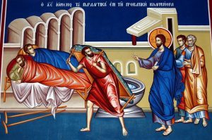 Ανάμεσα σε όλους και ένας παράλυτος για τριάντα οκτώ ολόκληρα χρόνια. «Τούτον ιδών ο Ιησούς κατακείμενον», τον βλέπει διερχόμενος από την κολυμβήθρα της Βηθεσδά ο Κύριος, τον πλησιάζει και του λέει: « θέλεις υγιής γενέσθαι;» Τι απλή ερώτηση! Και εκείνος δεν απαντά ευθέως «φυσικά, θέλω», αλλά λέει «Κύριε, άνθρωπον ουκ έχω, ίνα όταν ταραχθή το ύδωρ, βάλη με εις την κολυμβήθραν», δεν έχω κάποιον άνθρωπο ώστε μόλις ταραχθεί το ύδωρ να μου δώσει μια σπρωξιά και να μπω εγώ στο νερό πρώτος. Ενώ δε εγώ πλησιάζω «άλλος προ εμού καταβαίνει», κάποιος άλλος με προλαβαίνει. Ο Κύριος δεν του λέει τίποτε άλλο παρά μόνον «έγειρε, άρον τον κράββατόν σου και περιπάτει». Και μ΄ αυτόν τον τρόπο, με έναν απλούστατο, εντελώς διαφορετικό απ΄ όλο αυτό το σκηνικό τρόπο, ο Κύριος του δίνει την υγεία του, τον σηκώνει από την κλίνη της οδύνης και της δοκιμασίας. Και όχι μόνον αυτό, του δίνει και τη δύναμη να σηκώσει και το κρεβάτι του και να πάει στην ευχή του Θεού. Χωρίς καμία κίνηση! Με έναν μόνο λόγο! Ύστερα από τριάντα οκτώ χρόνια! Ύστερα από μία ολόκληρη ζωή!