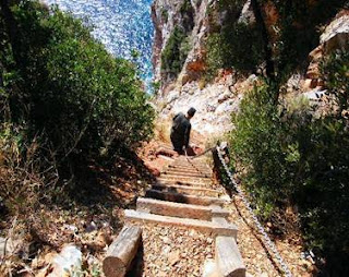 Eρημίτες στο Αγιο Ορος με τη βοηθεία των αλυσίδων που είναι καρφωμένες στα βράχια κατεβαίνουν τη δύσβατη πλαγιά του Καρουλίων του Αθωνα. Εδω η ζωή εχει μείνει δέκάδες χρόνια πίσω.Η καθημερινότητα των ερημιτων του Αθωνα είναι ενας ΄΄γολγοθάς΄΄.ΟΙ ιδιοι ομως εμφανιζονται να βιώνουν κατι πολυ φυσιολογικό.Ετσι κερδίζεται η βασιλεία των ουρανών,μου ειπε ενας 70χρονος ασκητης.Τα κατουνάκια,τα καυσοκαλύβια,τα ΄΄φρικτά΄΄ Καρούλια, η Βίγλα,η Μικρά Αγία Αννη,Ο Αγιος Βασίλειος είναι οι περιοχές του εγκαταταβοιούν οι ασκητές.Καλύβια και σπηλιές είναι τα ΄΄καταφύγια΄΄ τους. Ερημίτες στα ΄΄φρικτά΄΄ Καρούλια του Αγίου Ορους. Ειναι η ποιό απόκρυμνη περιοχή στον Άθωνα και μέσο μετακίνησης ειναι οι αλυσίδες που ειναι καρφωμένες στα βράχια και μια ξυλινη σκάλα που βλέπεται στη φωτό.Αφιερωμένοι ολοκληρωτικά στον ύψιστο.Η σκλήρη ασκηση ειναι τρόπος ζωής.Μια επιλογή που κυρίως απαιτεί άπειρη πίστη και αγαπή στον τριαδικό θεό μας.Ο ασκητής δεξιά εγκαταβοιεί σε σπήλαιο(η φωτο ειναι πρόσφατη)