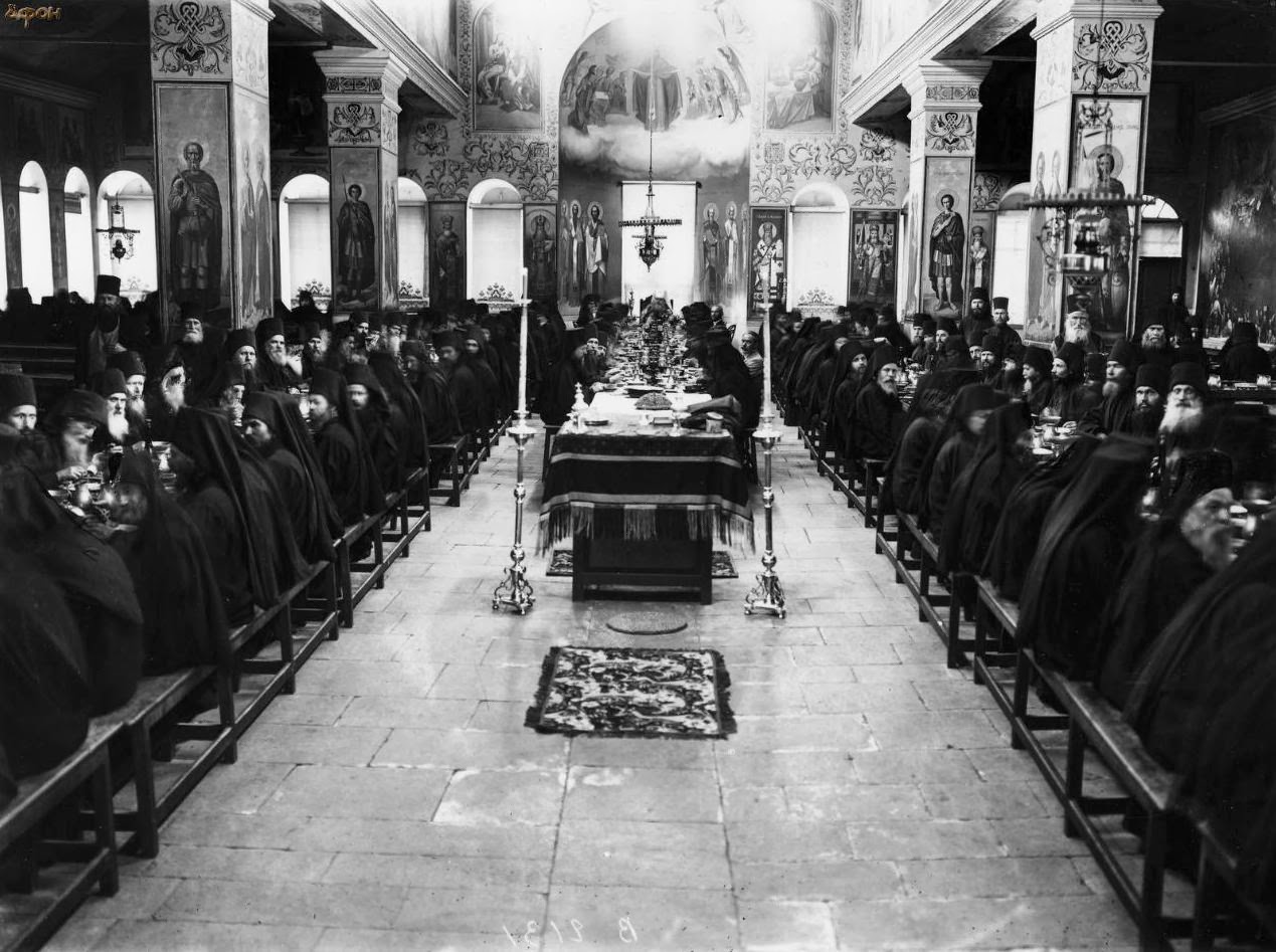 Η Τράπεζα του ρωσικού Κοινοβίου είναι η παλαιά βυζαντινή, με τας παλαιάς τοιχογραφίας, περιλαμβάνουσα εις δύο στοίχους μακράς τραπέζας διά 500 πατέρας. Εκεί έφαγεν ο Ηγούμενος μετά των μοναχών. Οι κοσμικοί και οι επίσημοι εκ των κεκλημένων έφαγον επάνω εις τους ξενώνας, εν πλούτω εδεσμάτων και ποικιλία μεγάλη. Οι εν τω μεγάλω μάλιστα Εστιατορίω φαγόντες, εν οις ο ιερουργήσας αρχιεπίσκοπος, ο παρεπιδημών πρώην Πατρών και άλλοι τινές εκ των ημετέρων, οι προσελθόντες αντιπρόσωποι της Κοινότητας και οι Ζωγραφίται πατέρες, είχον ενώπιον των μίαν πλουσιωτάτην παράθεσιν εδεσμάτων επί τη μεγάλη πανηγύρει του Μεγαλομάρτυρος, θαυμάζοντες την τέχνην και πολυτροπίαν της ρωσικής μαγειρικής, αμιλλωμένης προς την οψοποιίαν των μεγάλων Ευρωπαϊκών ξενοδοχείων, εν λεπτή καθαριότητι και αβρά περιποιήσει. Εκεί εθαυμάσαμεν τα ωραία σαρακοστιανά petits-pates, ευωδιάζοντα καθόλου ευλογίαν, και την παχείαν μουρούναν εξηυγενισμένην πανσόφως. Το δε θαυμαστότερον πάντων, όπερ δεν είδομεν εν Αθήναις ακόμη, ήτο το μαύρο χαβιάρι, εκλεκτόν και εύγεστον και ορεκτικόν, αριστοκρατικόν όψον, κοκκωτόν και σπυρωτόν εις θαυμάστόν τρόπον, νωπότατον δε και γλυκύτατον. Εγώ όμως λεληθότως πως επροτίμησα το λιπώδες εκείνο ξυρίχι, συνοδευόμενον υπό αφρώδους αγιορείτικου οίνου, κρατερώς εντείνοντος τας δυνάμεις του οδοιπόρου, όστις, απεφάσισε να βαδίζη τα μαύρα και έρημα εκείνα δάση, όπου το ήμισυ μέρος του ανθρώπου, ορφανόν και τεθλιμένον, αγωνίζεται τον κράτιστον των αγώνων της εξαϋλώσεως του γηίνου σαρκίου …