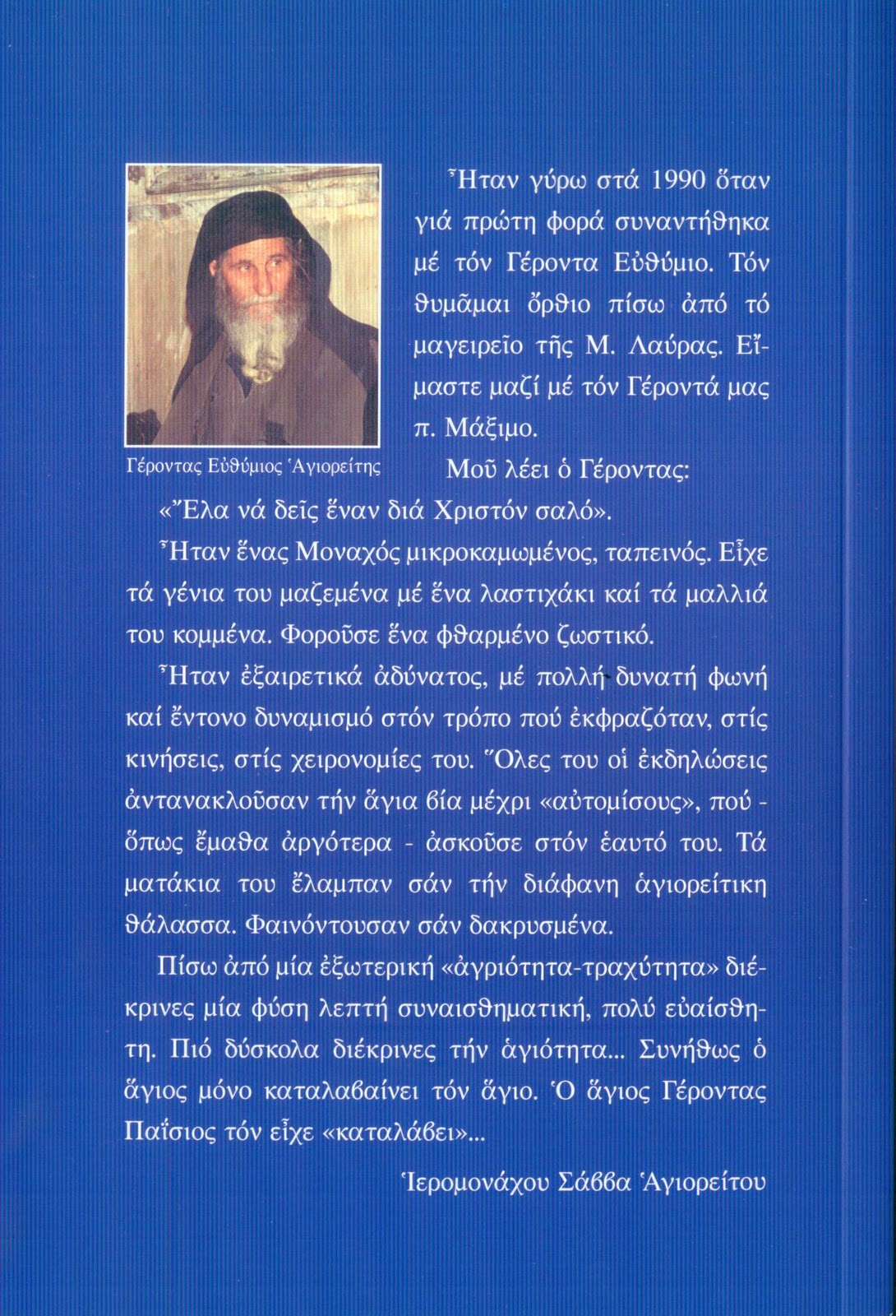 ΜΙΚΡΌΣ ΠΡΌΛΟΓΟΣ ΑΠΌ ΤΌ ΒΙΒΛΙΟ: ΙΕΡΟΜΟΝ. ΣΑΒΒΑ ΑΓΙΟΡΕΙΤΟΥ, «ΕΝΑΣ ΑΠΟ ΤΟΥΣ ΤΕΛΕΥΤΑΙΟΥΣ» ΓΕΡΟΝΤΑΣ ΕΥΘΥΜΙΟΣ ΑΓΙΟΡΕΙΤΗΣ (Ι.Μ. ΚΩΣΤΑΜΟΝΙΤΟΥ, ΒΙΓΛΑ, Ι.Μ. Μ. ΛΑΥΡΑΣ) 1915-2004, ΤΟ ΟΠΟΙΟ ΠΡΩΤΟΚΥΚΛΟΦΟΡΗΣΕ ΠΡΙΝ ΕΝΑ ΧΡΟΝΟ.