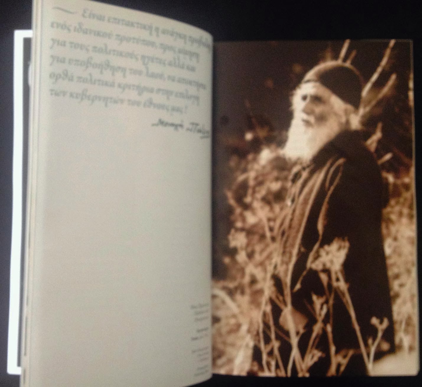 Χαρακτηριστικό είναι ότι στο συγγραφικό έργο “ΙΩΑΝΝΗΣ ΚΑΠΟΔΙΣΤΡΙΑΣ-Ο ΑΓΙΟΣ ΤΗΣ ΠΟΛΙΤΙΚΗΣ” στις σελίδες 78-79 υπάρχει η προφητική παρακαταθήκη του Γέροντος Παϊσίου, η οποία περιλαμβάνεται και στο κείμενο “ΥΠΕΡ ΤΟΥ ΓΕΝΟΥΣ ΚΑΙ ΤΗΣ ΠΑΤΡΙΔΟΣ” (Βίος Γέροντος Παϊσίου του Αγιορείτου, Ιερομονάχου Ισαάκ σελ.701), και η οποία αναφέρεται στην επιτακτική ανάγκη προβολής ενός προτύπου, προς μίμηση για τους πολιτικούς ηγέτες αλλά και για υποβοήθηση του λαού, να αποκτήσει ορθά πολιτικά κριτήρια στην επιλογή των κυβερνητών του έθνους μας.