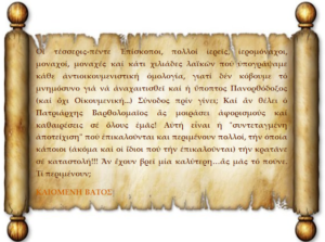 Φαντασθεῖτε τί ἔχει νά γίνει, ἄν αὔριο χιλιάδες πιστοί τοῦ ἀνακοινώσουμε ὅτι: “ΤΕΡΜΑ! ΜΕΧΡΙΣ ΕΔΩ! Ή μέ τήν Ὀρθοδοξία ἤ μέ τά συνέδρια τῶν ἀνόμων”!…