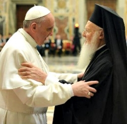 “Το έργον και η ευθύνη η οποία Σας αναμένει είναι τεραστία ενώπιον Θεού και ανθρώπων”Προσφώνησις τῆς Α. Θ. Παναγιότητος τοῦ Οἰκουμενικοῦ Πατριάρχου κ. κ. Βαρθολομαίου πρός τήν Αὐτοῦ Ἁγιότητα τόν Πάπαν Ρώμης Φραγκῖσκον Α’ (Βατικανόν, 20 Μαρτίου 2013) Ἁγιώτατε, Συγχαίρομεν ὁλοκαρδίως τήν Ὑμετέραν πεφιλημένην Ἁγιότητα, ἐν ὀνόματι τοῦ Κυρίου τῶν δυνάμεων, διά τήν θεοπρόβλητον ἐκλογήν καί ἐπαξίαν ἀνάληψιν τῶν νέων ὑψηλῶν καθηκόντων Σας ὡς Πρωθιεράρχου τῆς προκαθημένης τῆς ἀγάπης σεβασμίας Ἐκκλησίας τῆς Πρεσβυτέρας Ρώμης.Διαδέχεσθε εἰς τόν Θρόνον τοῦτον τόν ἄρτι ἀνδρειοφρόνως παραιτηθέντα διά λόγους ὑγείας καί κοπώσεως προκάτοχόν Σας Βενέδικτον τόν ΙϚ΄, τόν πρᾷον καί τῇ θεολογίᾳ καί τῇ ἀγάπῃ διακριθέντα. Τό ἔργον καί ἡ εὐθύνη ἡ ὁποία Σᾶς ἀναμένει εἶναι τεραστία ἐνώπιον Θεοῦ καί ἀνθρώπων. Ἡ ἑνότης τῶν Χριστιανικῶν Ἐκκλησιῶν τυγχάνει τό πρώτιστον μέλημα ἡμῶν καί εἶναι ἀσφαλῶς μία ἐκ τῶν βασικῶν προϋποθέσεων διά τήν ἐνώπιον τῶν ὀμμάτων τῶν ἐγγύς καί τῶν μακράν ἀξιοπιστίαν τῆς χριστιανικῆς μαρτυρίας μας. Πρός ἐπίτευξιν αὐτῆς χρειάζεται νά συνεχισθῇ ὁ ἀρξάμενος θεολογικός διάλογος, διά νά κατανοηθῇ ἀπό κοινοῦ καί προσεγγισθῇ ἡ ἀλήθεια τῆς πίστεως καί ἡ ἐμπειρία τῶν Ἁγίων καί ἡ κοινή, δι’ Ἀνατολήν καί Δύσιν, παράδοσις τῆς πρώτης χριστιανικῆς χιλιετίας. Διάλογος ἐν ἀγάπῃ καί ἀληθείᾳ, ἐν πνεύματι ταπεινώσεως καί πρᾳότητος, διά τῶν ὅπλων τῆς ἀληθείας. Ἡ παγκόσμιος οἰκονομική κρίσις, ἐξ ἄλλου, ἀπαιτεῖ ἐπιτακτικῶς τήν ὀργάνωσιν ἀνθρωπιστικῆς δράσεως, διά τήν ὁποίαν ἔχετε μεγάλην ἐμπειρίαν ἐκ τῆς μακρᾶς καί εὐδοκίμου διακονίας Σας ὡς Καλοῦ Σαμαρείτου ἐν Λατινικῇ Ἀμερικῇ, ὅπου ἐδοκιμάσατε ὡς ποιμήν τήν πικρίαν τῆς ἀνθρωπίνης ταλαιπωρίας καί δυστυχίας, ὅσον ὀλίγοι ἀσφαλῶς. Πρέπει νά παρακινηθοῦν οἱ ἔχοντες νά προσφέρουν εἰς τούς μή ἔχοντας οἰκειοθελῶς καί μετά ἱλαρότητος. Κατ᾿ αὐτόν τόν τρόπον θά ἐξασφαλισθῇ διά τῆς δικαιοσύνης ἡ εἰρήνη, ἡ ὁποία εἶναι τό πανανθρώπινον αἴτημα καί ἡ προσμονή πάντων τῶν ἐθνῶν καί τῶν λαῶν. Ὀφείλομεν νά τρέφωμεν τούς πεινῶντας, νά ἐνδύωμεν τούς γυμνούς, νά περιποιώμεθα τούς ἀσθενεῖς καί ἐν γένει νά μεριμνῶμεν διά τούς ὄντας ἐν ἀνάγκαις, διά νά ἀκούσωμεν παρά τοῦ Κυρίου τό “δεῦτε οἱ εὐλογημένοι τοῦ Πατρός μου, κληρονομήσατε τήν ἡτοιμασμένην ὑμῖν βασιλείαν” (Ματθ. κε΄ 34). Ἡ ὑπό τῆς Ὑμετέρας πεφιλημένης καί τετιμημένης Ἁγιότητος ἐπιλογή τῆς ἁπλότητος κατέστησε καί καθιστᾷ ἐμφανές τό κριτήριόν Σας διά τό οὐσιῶδες. Τοῦτο πληροῖ τάς καρδίας ὅλων, τῶν ὅπου γῆς πιστῶν σας καί ἐν γένει τῶν συνανθρώπων, ἐλπίδος∙ ἐλπίδος ὅτι τό κριτήριόν Σας τοῦτο θά χρησιμοποιηθῇ εὐρύτερον, οὕτως ὥστε ἡ κρίσις καί τό ἔλεος, τά βαρύτερα τοῦ νόμου, νά ἔχουν διά τήν Ἐκκλησίαν τήν προέχουσαν σημασίαν.